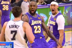 你干嘛🤣詹姆斯豪迈庆祝再踩霸王步 没踩完被海斯偷袭中断!