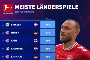体育资讯9月14日讯 德国转会市场列出了德甲现役球员国家队出场次数榜,埃里克森144场居首,诺伊尔、凯恩二三位。