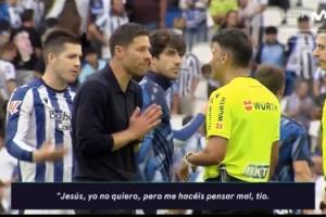比赛第32分钟,皇家社会反击机会,赫伊森犯规,主裁判曼萨诺果断出示红牌。转播方拍到了皇马主帅阿隆索与裁判曼萨诺沟通的内容。