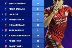 以下为阿森纳、利物浦交锋参与进球数排行: