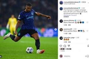 阿坎吉社媒晒出比赛照片,并写道:“以一场胜利开启欧冠征程,实至名归的结果,纪律严明的表现。”