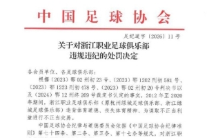 体育资讯1月29日讯 中国足协公布足球行业“假赌黑”处罚决定,浙江职业足球俱乐部被扣5分并罚款60万元。
