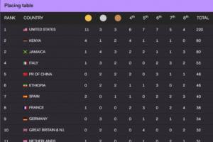 世锦赛官网更新名次得分表,夺得11金3银3铜的美国以220分断层领跑,4金1银2铜的肯尼亚和1金4银3铜的牙买加均是80分并列第2,2银2铜的中国48分排名第5,东道主日本29分第12、韩国7分第39。