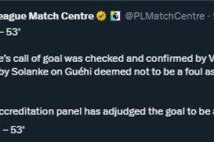 裁判的进球判罚经过VAR检查和确认,索兰克对格伊的接触不构成犯规,因为前者碰到了球。进球认证小组已经判定为该进球是索兰克的进球。