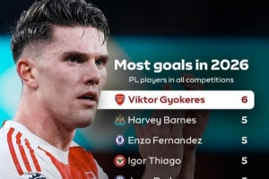 体育资讯2月8日讯 在本轮英超,阿森纳3-0击败桑德兰,约克雷斯梅开二度。以下为英超球员在2026年各项赛事进球榜,其中约克雷斯居首。