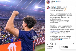 体育资讯9月24日讯 在获得金球奖第三名后,巴黎中场维蒂尼亚更新了社交媒体。