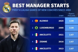 体育资讯9月24日讯 德国转会市场统计了本世纪皇马新帅前6场联赛的场均积分,并列出榜单,阿隆索、卢森博格3分居首。