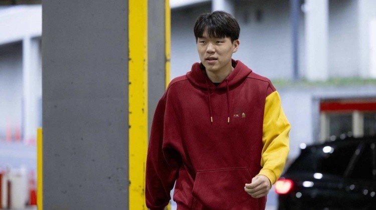 从图中可以看到,杨瀚森穿着一件红黄色卫衣来到球馆。