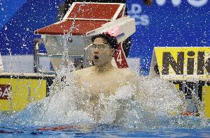 覃海洋在预赛中游出了1:00.49。