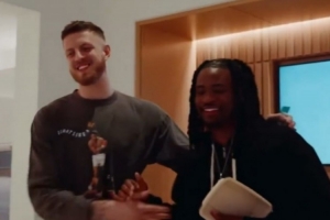 体育资讯10月10日讯 今日雷霆中锋哈滕在个人播客频道晒出了媒体日的纪录片,期间他和队友卡森-华莱士互相调侃争做对方老爸。