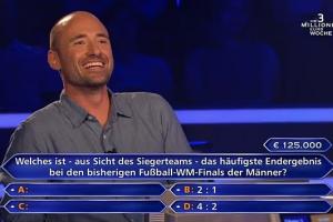 马克-奥芬巴赫尔在这档节目中一路过关斩将,将奖金积累到了可观的数额,这时主持人向他提出了新问题:“男足世界杯决赛中,出现最多的比分是多少?1-0?2-1?3-1?还是4-2?”