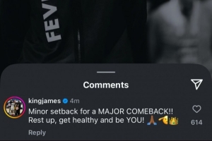湖人球星詹姆斯评论道:“小小的挫折成就大大的回归!好好休养,恢复健康,做你自己!🙏🏾🫡🏌🏾♂️👑”