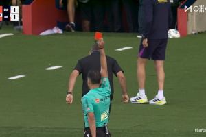 比赛补时阶段,弗里克不满裁判,两黄变一红被罚下,他将无缘下轮的国家德比。