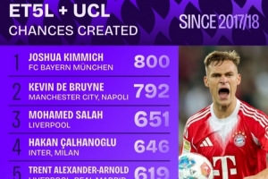 体育资讯9月7日讯 数据机构squakwa统计了17-18赛季以来五大联赛+欧冠的创造机会情况,基米希力压德布劳内居首。
