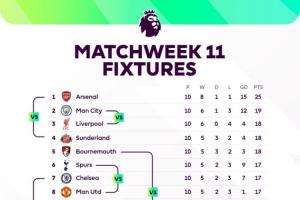 体育资讯11月07日讯 本周末将迎来英超第11轮的较量,赛前英超官方用一张图表清晰展示了本轮交手各队的名次对比。
