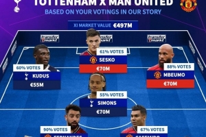 体育资讯11月8日讯 北京时间今天晚上20点30分,热刺将在英超第11轮比赛中主场对阵曼联。德国转会市场根据关注者的投票列出热刺+曼联阵容,B费、舍什科、西蒙斯、范德芬在列。