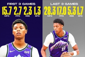 在他的生涯前三场比赛,他场均出场15.7分钟,拿到2.7分2.3篮板1.3抢断;而在最近三场比赛,他场均出场28.3分钟,可以拿到17分5.3篮板1.7抢断。