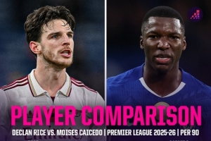 体育资讯11月28日讯 北京时间12月1日凌晨,切尔西将在英超第13轮比赛中主场对阵阿森纳,Opta对比了赖斯和凯塞多本赛季英超的数据。